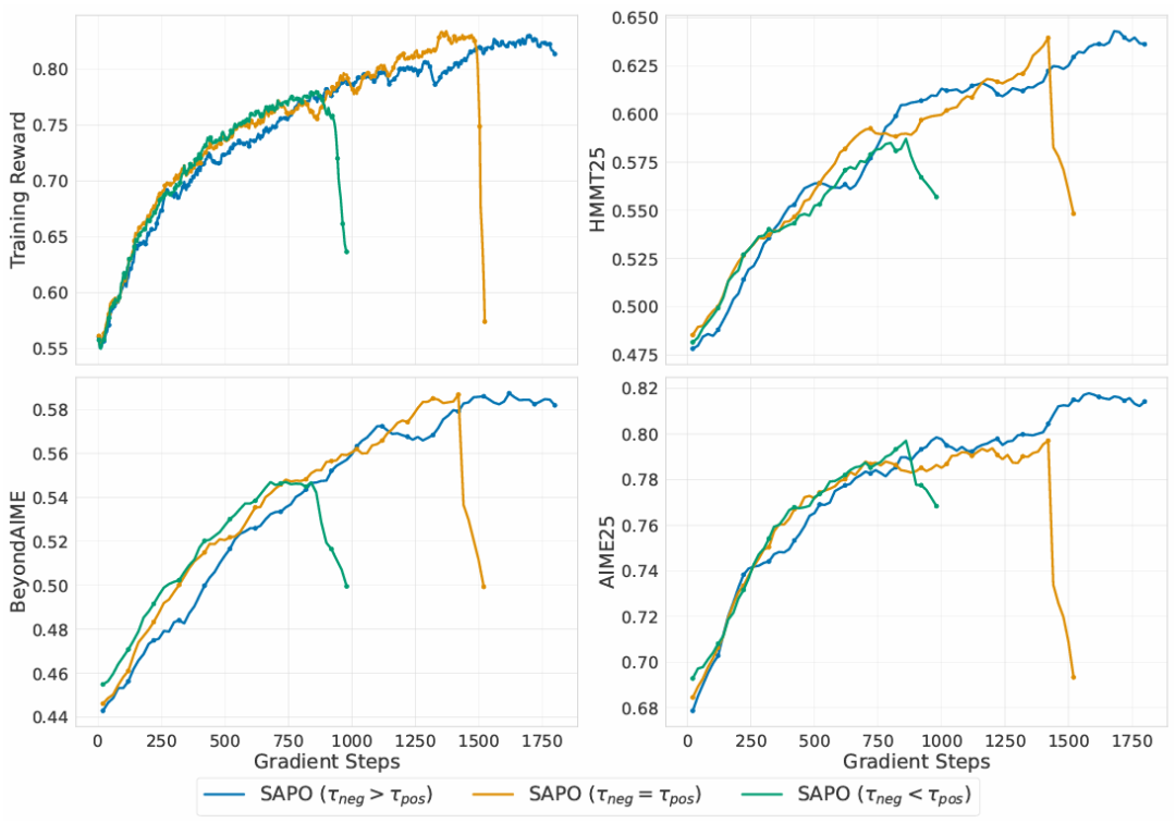 不对称温度设计的实验结果如图5显示,当τneg > τpos(如 1.05 > 1.0)时训练最稳定,反之则更易发散,验证了对负优势 token 使用更高温度能有效抑制梯度噪声、提升稳定性。