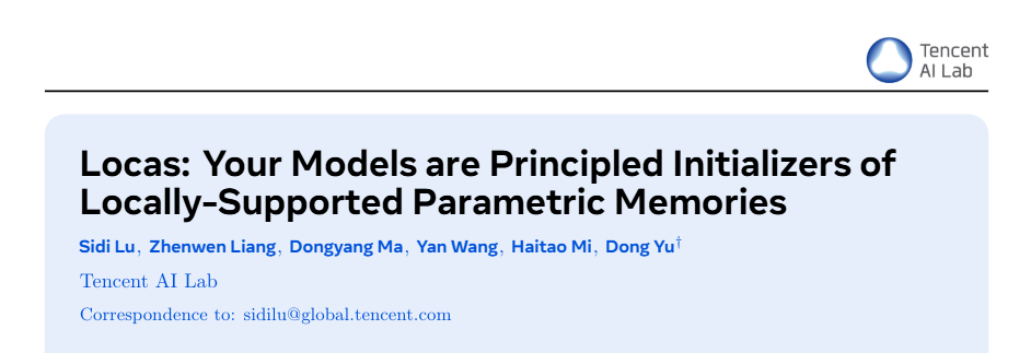 而就在离职消息传出前后不久,俞栋团队的最后一篇工作——Locas,该成果是针对测试时训练痛点的新型参数化记忆方案!