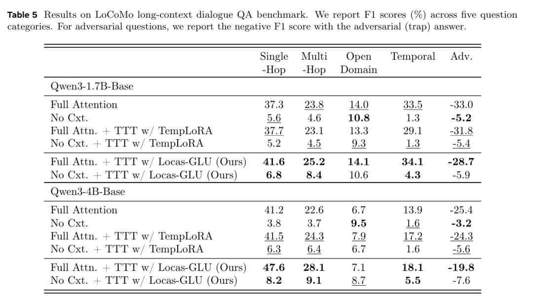 在没有任何对话上下文的情况下进行评估(见表 5 中的 "No Cxt." 行),Locas-GLU 持续优于 TempLoRA,尤其是在多跳问题上(Qwen3-1.7B-Base 上为 8.4% vs. 4.5%,Qwen3-4B-Base 上为 9.1% vs. 6.4%)。这表明 Locas-GLU 能更有效地将对话事实内化为持久的参数化记忆,即使无法访问原始上下文也能进行回忆。在时间问题上的差距(Qwen3-1.7B-Base 上为 4.3% vs. 1.3%)进一步验证了研究团队的侧向架构能更好地捕捉时间关系。