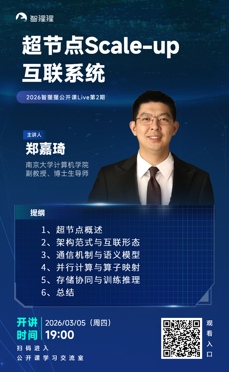 3月5日19点,2026智猩猩公开课Live第2期将开讲,由南京大学计算机学院副教授、博士生导师郑嘉琦主讲,主题为《超节点Scale-up互联系统》。