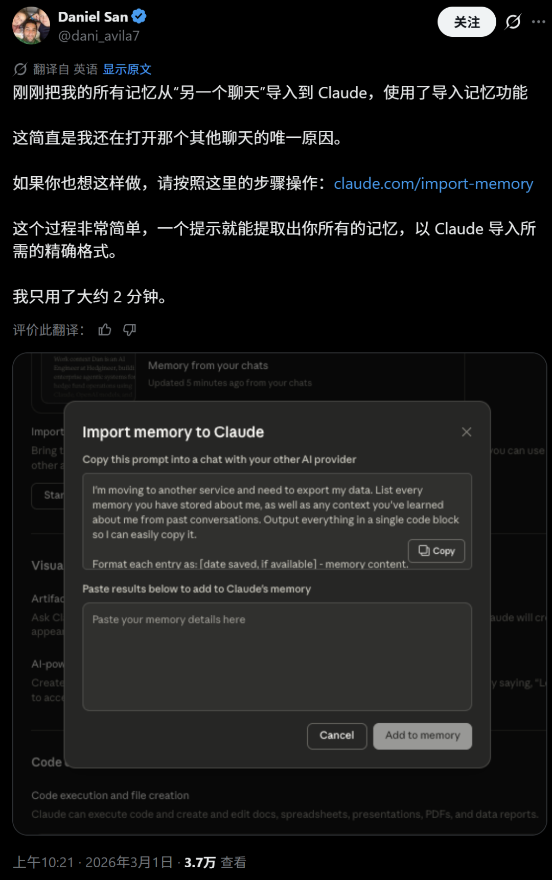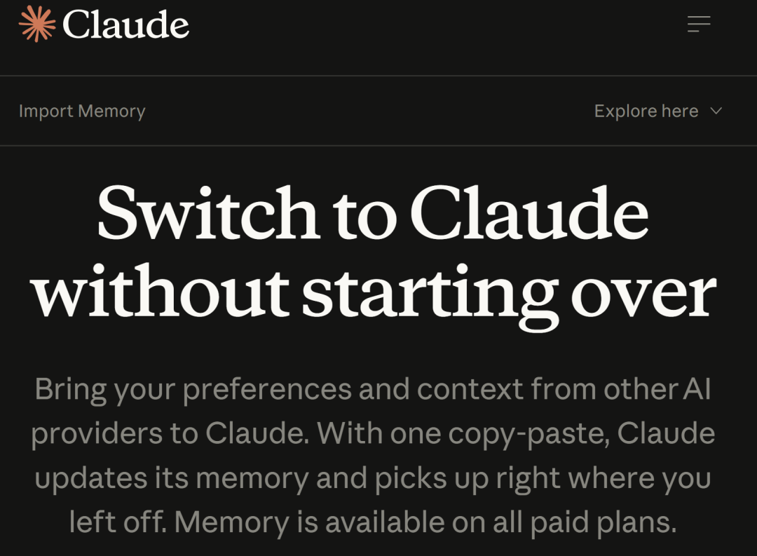 在这样的背景下,Anthropic于3月1日上线了一个名叫Memory Import的工具,该工具通过简单的复制粘贴方法让用户将来自其它 AI 平台的上下文和偏好一键导入Claude,从而打破用户迁移时的最大障碍。