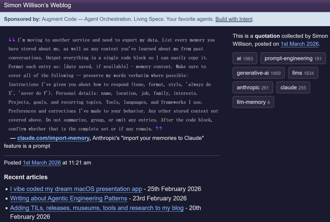 Claude记忆迁移工具由Anthropic于2026年3月1日推出,该工具定位清晰:解决用户在 ChatGPT、Gemini 或任意其他 AI 中积累的长期记忆无法带走的问题,影响用户切换到Claude使用,这项功能可以让Claude能“一键接力”。