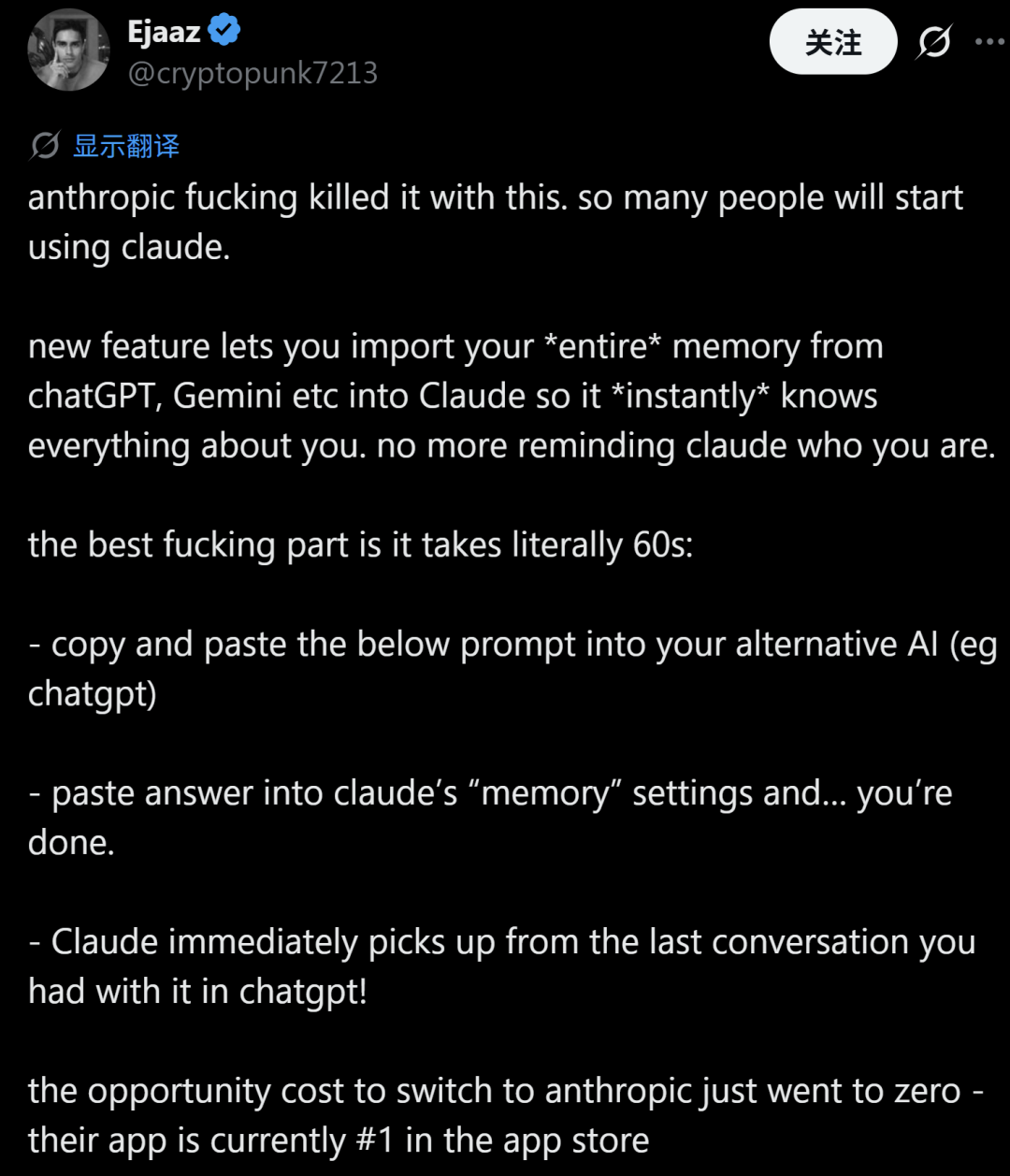 AI领域高影响力用户Ejaaz发文大力赞扬表示Anthropic干的漂亮,这直接将从ChatGPT切换到Anthropic的成本降低到了0,该评论获得了超2万的点赞量。