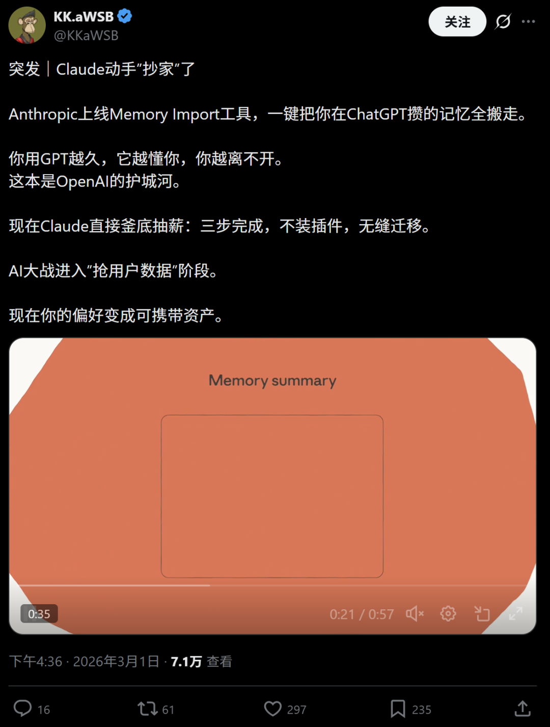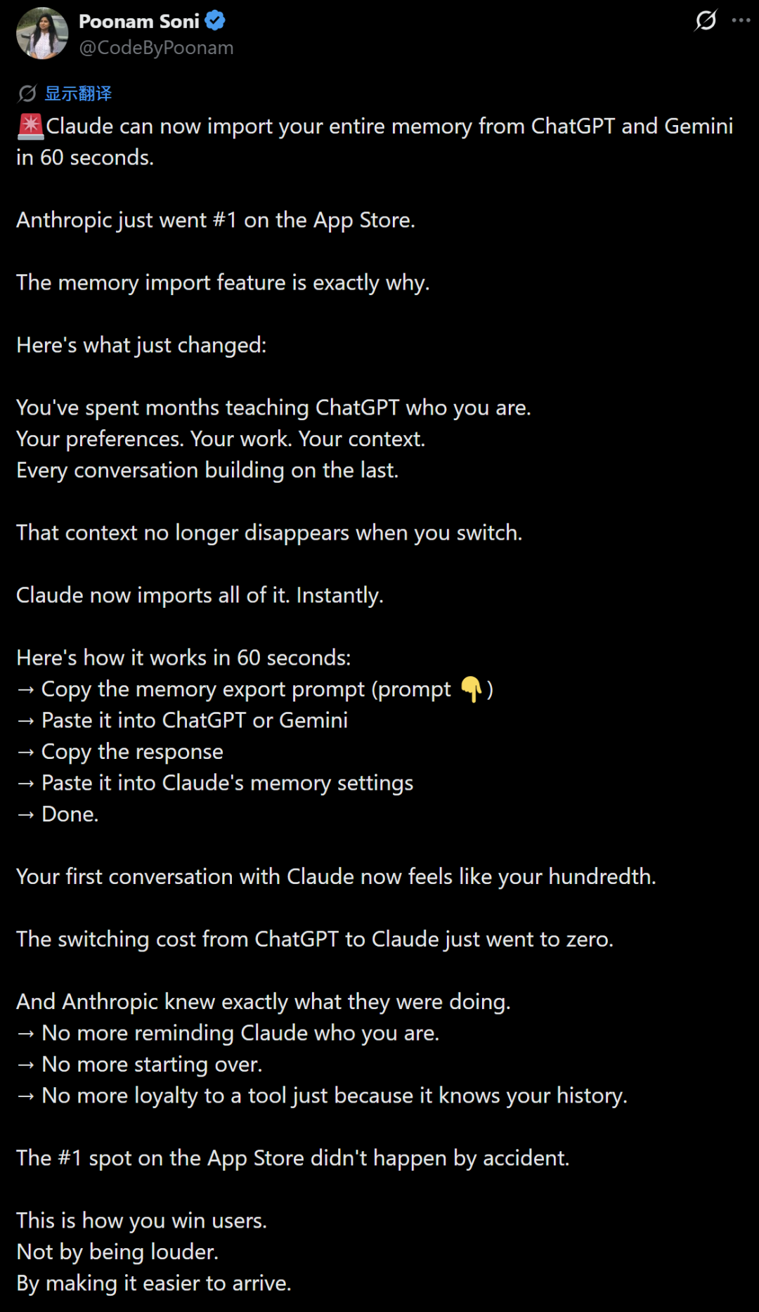 在 OpenAI 军方协议落地、行业政策分歧凸显的当下,Anthropic 这步“记忆迁移”堪称教科书级反击。它将原本属于平台的“用户记忆资产”还给用户,彻底打破了“用得越久越离不开”的传统护城河。