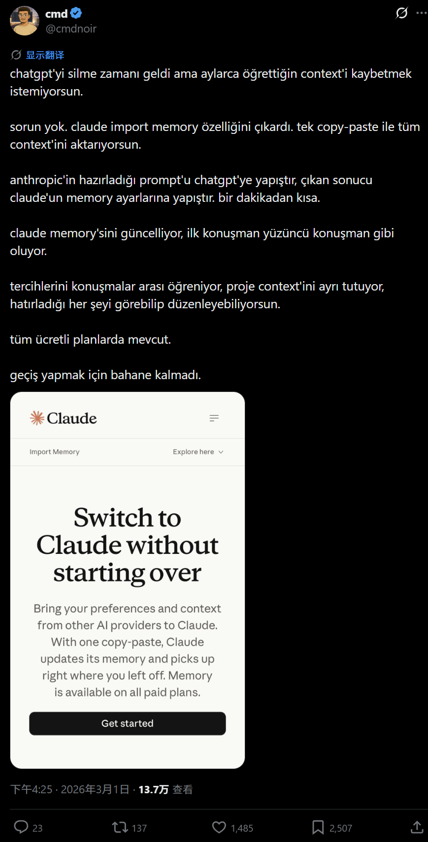 也有开发者用户表示,现在没有不从ChatGPT换到Claude的借口了,即使几个月积累的上下文也能转移走。