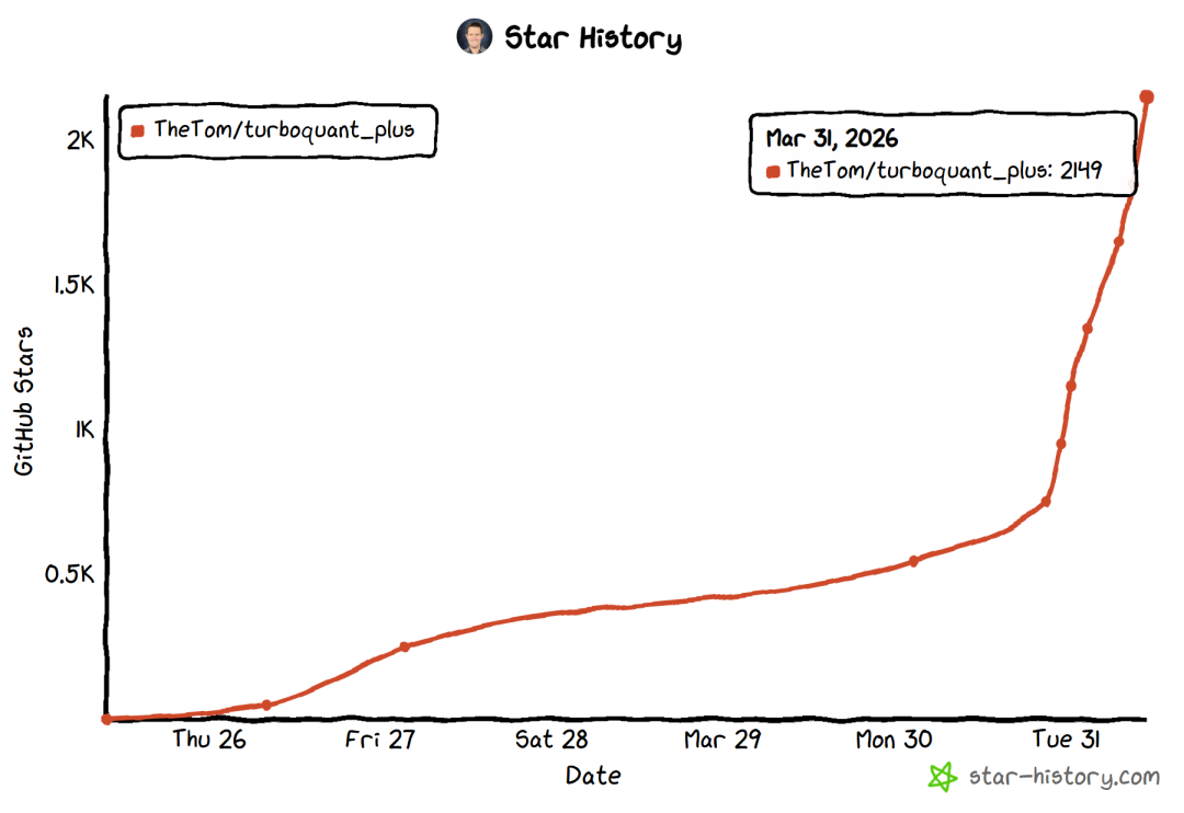 他仅用7天,就用Claude辅助,从论文数学公式出发,完整复现并超越原版,打造出turboquant_plus。GitHub短短5天不到就冲到2K stars(目前仍在疯涨)。