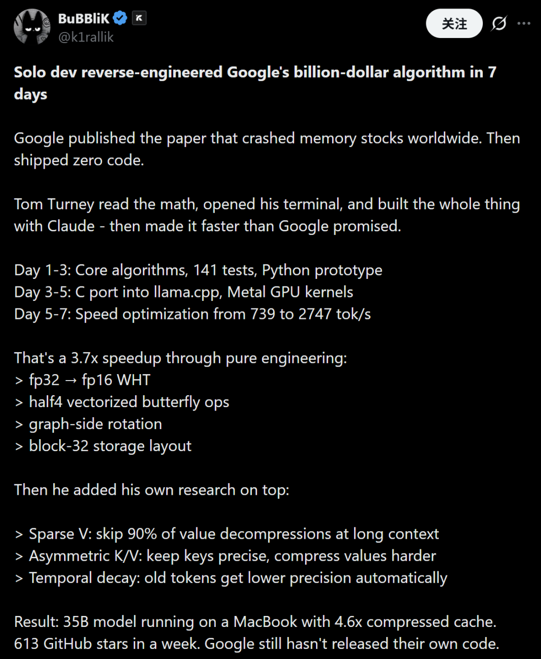 这不是简单的“复现”,而是一场彻头彻尾的超越。从Python原型到llama.cpp原生支持,从Metal GPU内核到Sparse V、Asymmetric K/V、Temporal Decay等独创优化,Tom用Claude作为超级搭档,把数学公式直接翻译成能跑在MacBook、RTX显卡甚至低配消费级硬件上的极致性能。