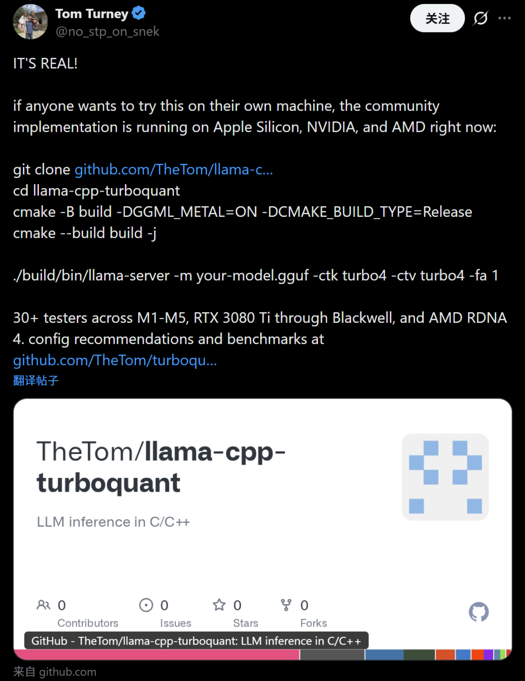 Tom Turney本人最新发帖,宣布社区实现已在Apple Silicon/NVIDIA/AMD全平台跑通,附build指令和benchmark链接,强调“30+测试者已验证”。