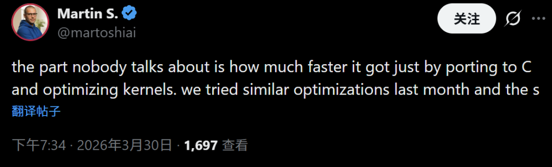 有开发者强调了光是移植到C语言并优化内核就已经提高了非常高的速度,而这是很多人忽略的地方。