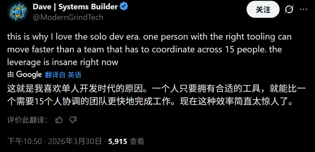 个人开发者@ModernGrindTech借此高度评价道,“solo dev时代一人胜过15人团队协调”,现在这种效率过于惊人。