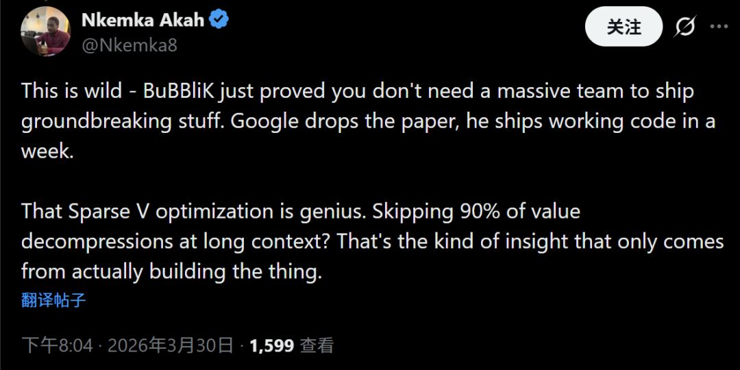 独立开发者Nkemka Akah评论道“Sparse V”优化是天才之举,直接在上下文中跳过90%的值解压缩。