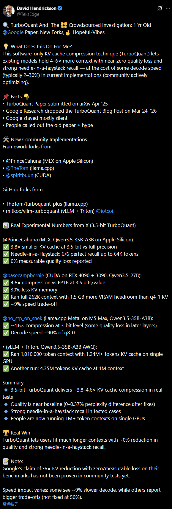 AI创业者、Columbia PhD、Generative Software Engineering作者David Hendrickson引用了该仓库,并将TurboQuant称之为“Real Win(真正的胜利)。