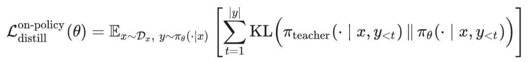 On-Policy Distillation旨在最小化学生策略 与教师策略 在学生策略自身生成的轨迹分布上的KL散度: