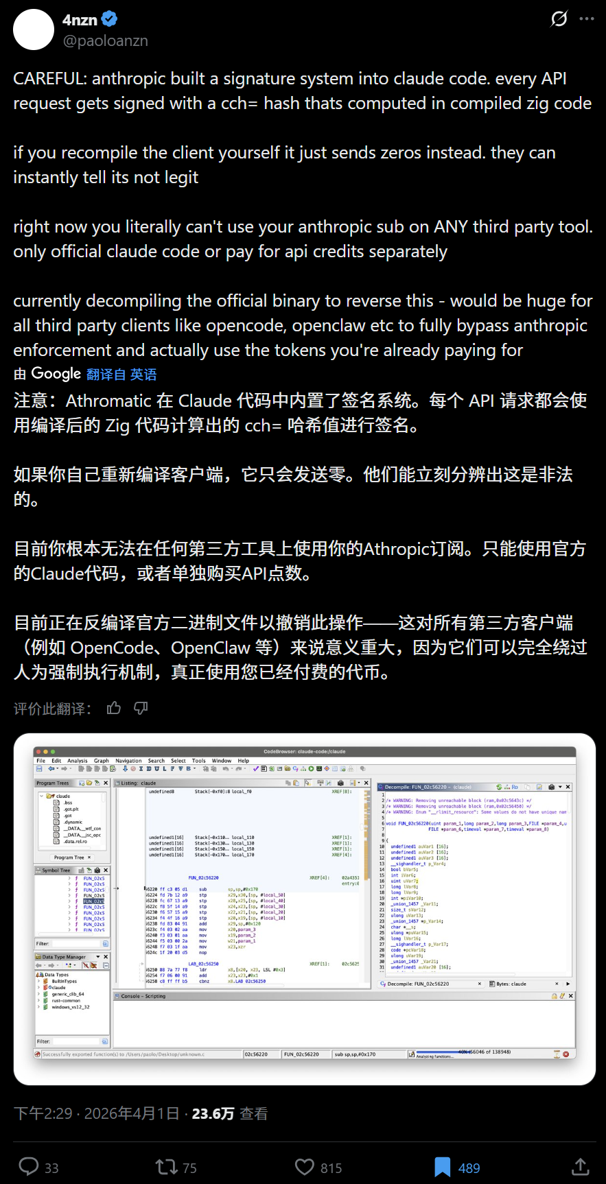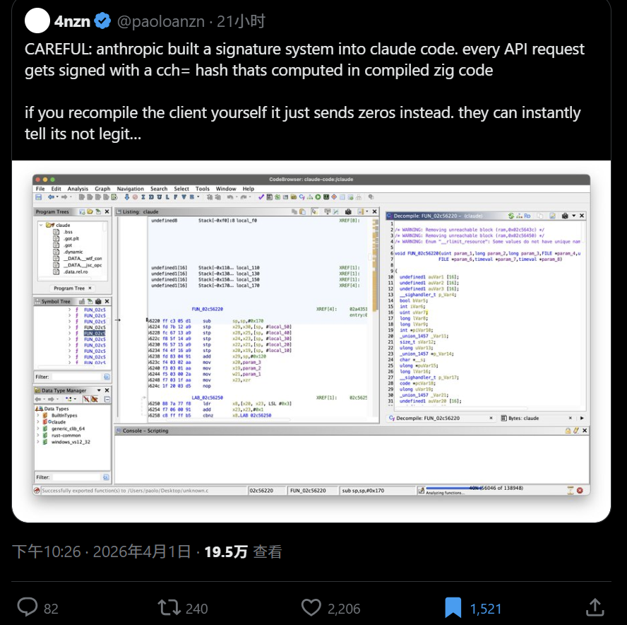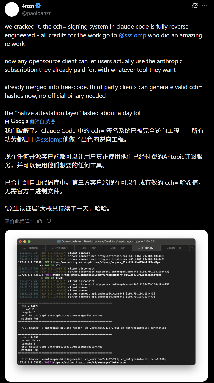 4月1日凌晨,@paoloanzn率先在X平台公开cch机制并发起逆向挑战。