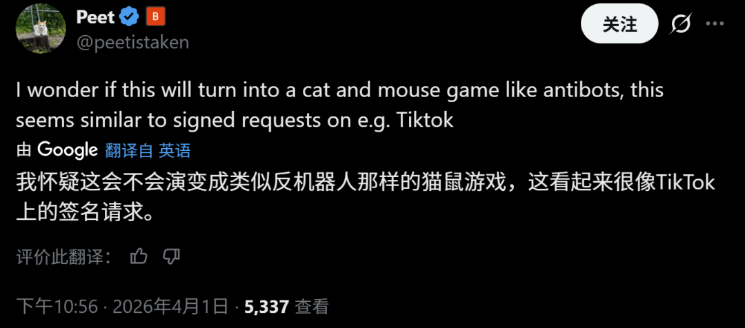 开发者Peet对比TikTok的签名请求,开始担心这可能会演变为“猫鼠游戏”。