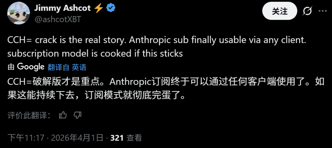 也有用户表示,CCH破解后,Anthropic的订阅可以用在其他地方了,但是这对Anthropic的订阅模式来说就完全是灾难。
