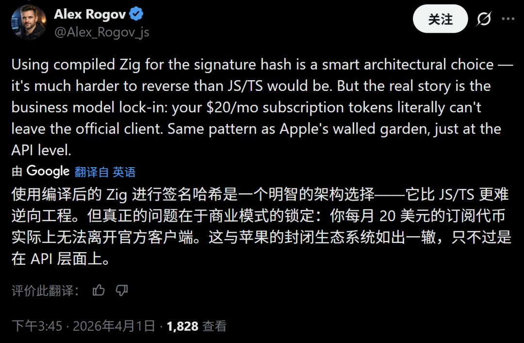 JS架构师Alex分析,认可Zig设计的聪明之处,但是直至问题核心,也就是商业模式的锁定,让订阅模式的token无法离开官方客户端,就像苹果的闭源生态一样。