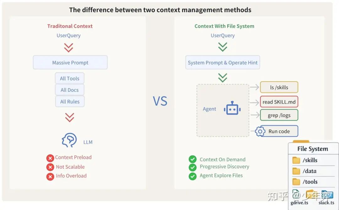 如Anthropic所说,File System实际上是对Agent自主加载上下文的一种抽象。(允许Agent自行探索)