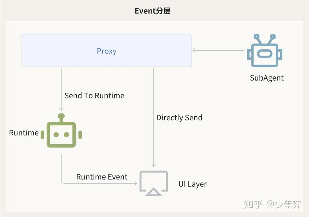 我的主Agent不想感知这些东西(我感觉并没有必要),因此对于这些问题和交互,我有一个Proxy层,对于不需要让主Agent感知的事情,SubAgent自己通过Proxy直接转给了UI Layer,不经手我Runtime层的主agent。